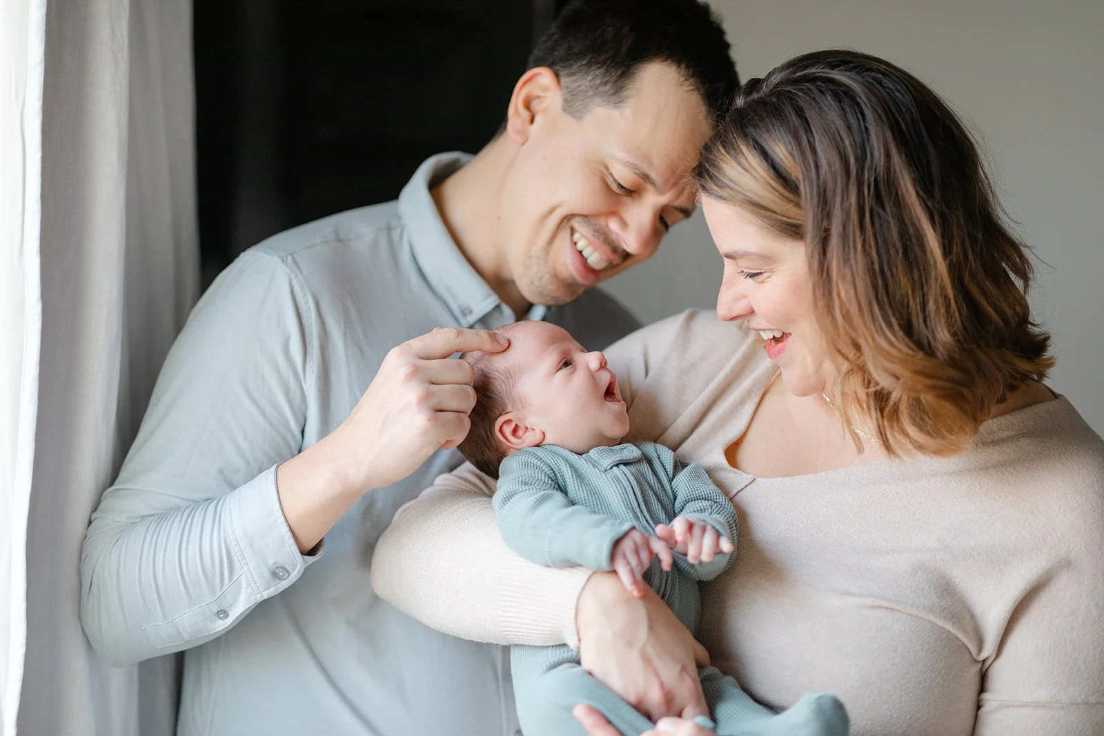 I’ll come to your home sometime midday, when the natural light indoors is usually at its best. These sessions are all about connection—cuddling on the couch, a quiet moment between you and your baby, a partner kiss on the forehead while someone rocks the little one. Nothing staged, just real moments unfolding in your own space.